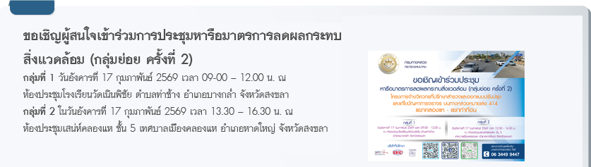 ทางหลวงหมายเลข 414 แยกคลองแห - แยกท่าท้อน เป็นเส้นทางที่ใช้เลี่ยงเมืองหาดใหญ่แทนถนนกาญจนวนิช ปัจจุบันทางหลวงดังกล่าวเกิดปัญหาการจราจรติดขัด ซึ่งทำให้เกิดความล่าช้าในการเดินทาง โดยเฉพาะชั่วโมงเร่งด่วน เนื่องจากทั้งสองฝั่งของโครงการเป็นชุมชนหน่าแน่น โดยมีทั้งสถานที่สำคัญทางธุรกิจและสถานที่ท่องเที่ยวที่สำคัญ ดังนั้นจึงจำเป็นต้องสำรวจและออกแบบปรับปรุงและแก้ไขปัญหาการจราจรบนทางหลวงหมายเลข 414 แยกคลองแห แยกท่าท้อน และเครือข่ายทางหลวงใกล้เคียงซึ่งจะทำให้เดินทางได้สะดวก รวดเร็ว และมีความปลอดภัยมากขึ้น อย่างไรก็ตาม จากการตรวจสอบพื้นที่โครงการเบื้องต้น พบแหล่งโบราณสถานที่ยังไม่ขึ้นทะเบียนอยู่ในระยะ 1 กิโลเมตร จำนวน 1 แห่ง คือ วัดท่าแซ จึงเข้าข่ายต้องจัดทำรายงานการประเมินผลกระทบสิ่งแวดล้อม (EIA) ตามท้ายประกาศกระทรวงทรัพยากรธรรมชาติและสิ่งแวดล้อม เรื่อง การกำหนดโครงการ กิจการ หรือการดำเนินการ ซึ่งต้องจัดทำรายงานการประเมินผลกระทบสิ่งแวดล้อม และหลักเกณฑ์ วิธีการ และเงื่อนไขในการจัดทำการประเมินผลกระทบสิ่งแวดล้อม พ.ศ.2566 ประกาศในราชกิจจานุเบกษา เล่มที่ 141 ตอนพิเศษ 4ง วันที่ 5 มกราคม 2567 |